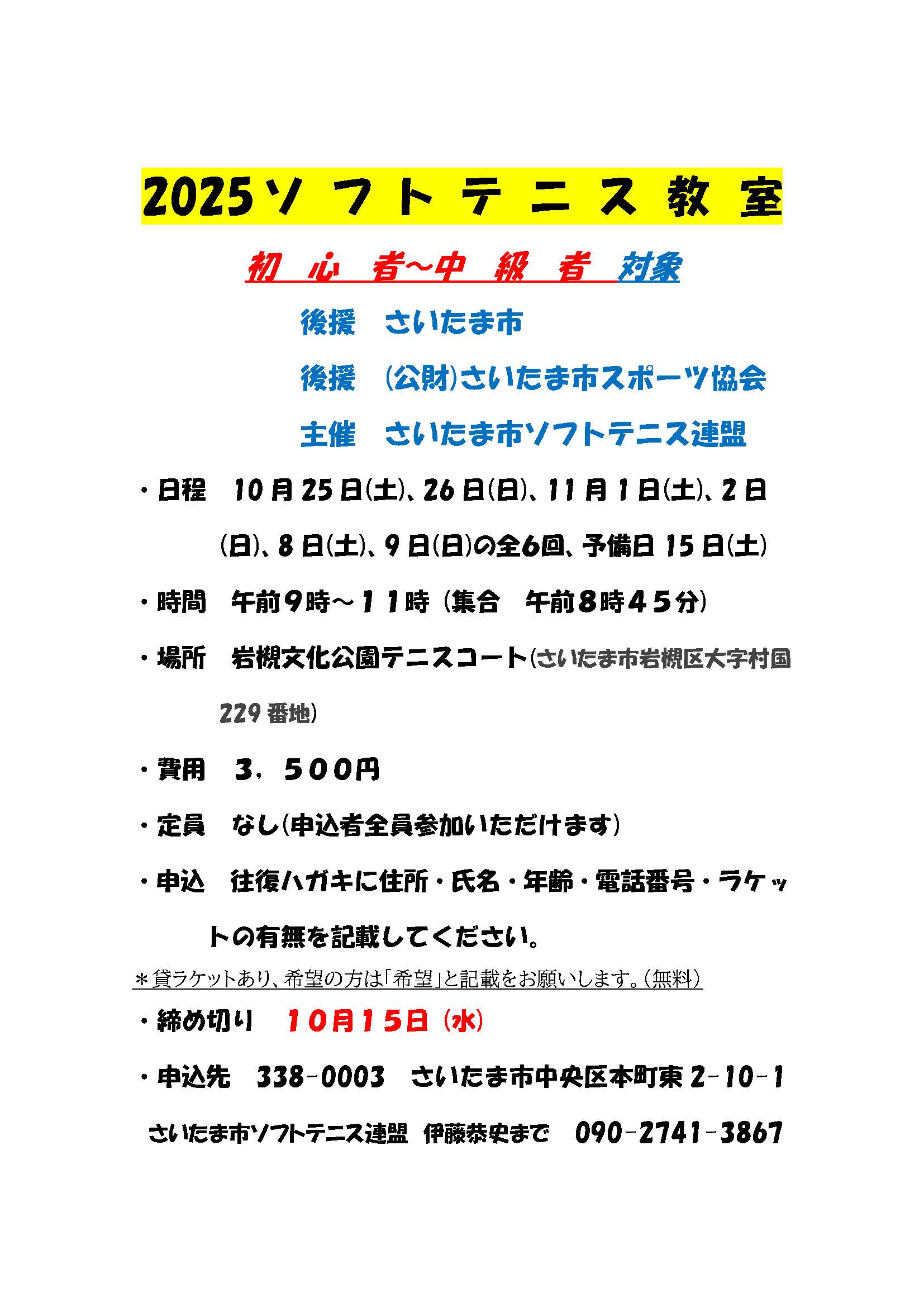 【加盟団体情報:募集】ソフトテニス教室 参加者募集案内 投稿日: 2025/9/18 さいたま市ソフトテニス連盟が主催する「ソフトテニス教室2025秋」の参加者を募集しております。 詳しくは下記チラシをご覧ください。 ソフトテニス教室2025秋